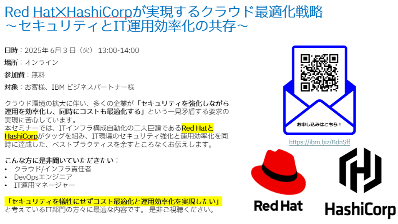 # セミナー概要 ### クラウド環境の拡大に伴い、多くの企業が直面している二つの大きな課題があります。 一つは「セキュリティ強化とスピードのジレンマ」、もう一つは「コスト肥大化と運用複雑性」です。 IDC調査によれば、クラウド環境でのセキュリティインシデントの約80%が設定ミスに起因しており、自動化されていない手動プロセスがその主な原因となっています。 同時に、クラウドコストの予測不能な増加も深刻な問題となり、クラウド支出の平均30%が無駄になっています。 このような状況の中、多くの企業が「セキュリティを強化しながら運用を効率化し、同時にコストも最適化する」という一見矛盾する...