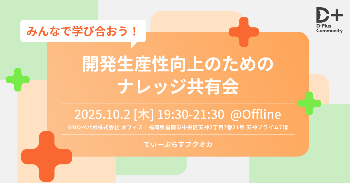 ## 📝イベント概要 開発生産性コミュニティ|D-Plus🐬が、福岡で初のコミュニティイベントを開催いたします🌟 本イベントでは、開発生産性向上に興味のある福岡のエンジニアの皆様向けに、明日からすぐにトライできる開発生産性向上の取り組みをLT形式で学んでいただける場を提供いたします。 また、懇親会ではざっくばらんに話しながら、日々の悩みを相談されたり、刺激を受けたりすることで、明日から前向きに開発いただけるようなイベントを目指しております! ### 🧑💻こんな方におすすめ 開発生産性向上に向けた取り組みに興味がある方であればどなたでも歓迎です! *...