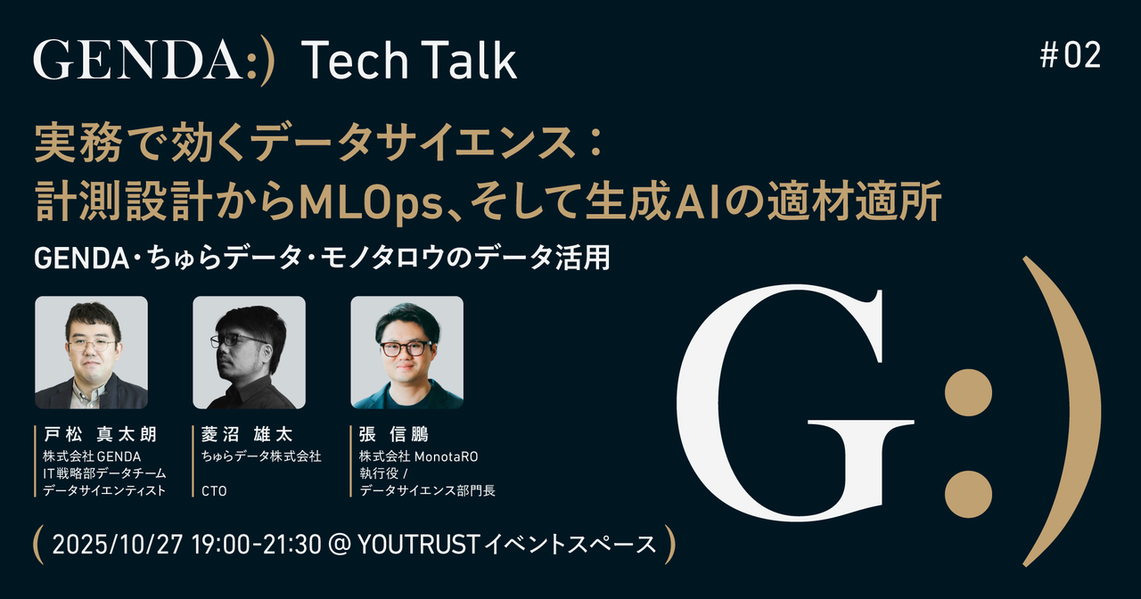 ### 実務で効くデータサイエンス:計測設計からMLOps、そして生成AIの適材適所 #### 開催概要 生成AIの台頭により、企業におけるデータの蓄積と利活用はこれまで以上に重要性を増しています。本イベントでは、「実務で効くデータサイエンス」をキーワードに、計測設計からMLOps、そして生成AIの適材適所まで、現場で本当に役立つ知見を深掘りします。 登壇者には、GENDA、ちゅらデータ、モノタロウといった多様なバックグラウンドを持つデータ活用の実践者が集結。各社が直面する課題や工夫、実際に現場で成果を生み出すための取り組みを共有します。理論にとどまらず「どう活かすか」に焦点を当て...