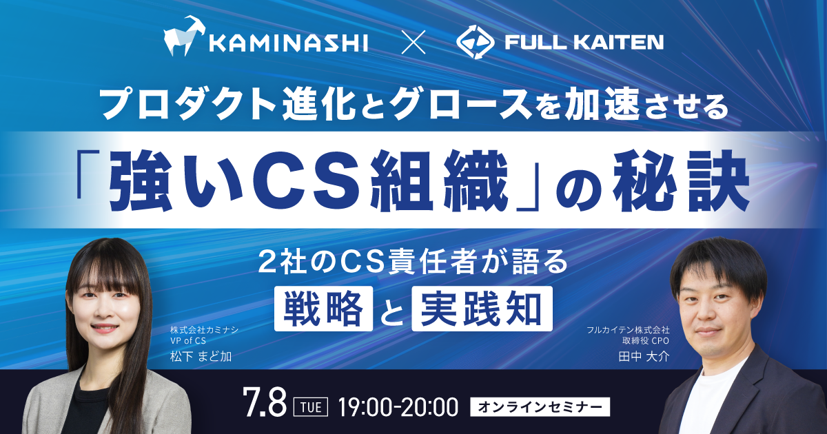 SaaS企業において、顧客の声を最前線で受け止めるカスタマーサクセス(CS)は、事業成長の要となる存在です。 一方で、CS組織のノウハウはまだ発展途上であり、「業務が属人化しやすい」「顧客の声をプロダクトに反映しきれない」といった課題を抱える企業も少なくありません。 本ウェビナーでは、急成長中のSaaSスタートアップ・カミナシのVP of CS 松下まど加氏と、フルカイテンのCPO 田中が登壇。 それぞれの視点から、CS組織の立ち上げ・仕組み化・プロダクト連携における成功と失敗、そしてそこから得た具体的な学びを共有します。 さらに、現在進行形で取り組んでいる最新事例についてもご紹介します。 CSに関わるすべての方にとって、すぐに活かせる実践的なヒントが満載の内容です。 ぜひご参加ください。