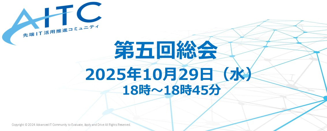 ## 開催概要: 2021年10月22日にコンソーシアムからコミュニティに生まれ変わったAITCですが、この10月1日に設立5年目を迎えました。これに伴い、来る10月29日(水)に『第回五回総会』をオンラインで開催いたします。 総会議事としては、四年度の活動実績ならびに五年度の活動計画等についてご審議いただきます。 正会員の皆様におかれましては、必ずご出席いただき、議決権の行使をお願いいたします。 折角の機会ですので、一人でも多くの方に本会の活動をご紹介したく、AITC非会員のご参加を歓迎いたします。 先端ITとAITCの活動にご関心をお持ちの方、どうぞ非会員枠から...