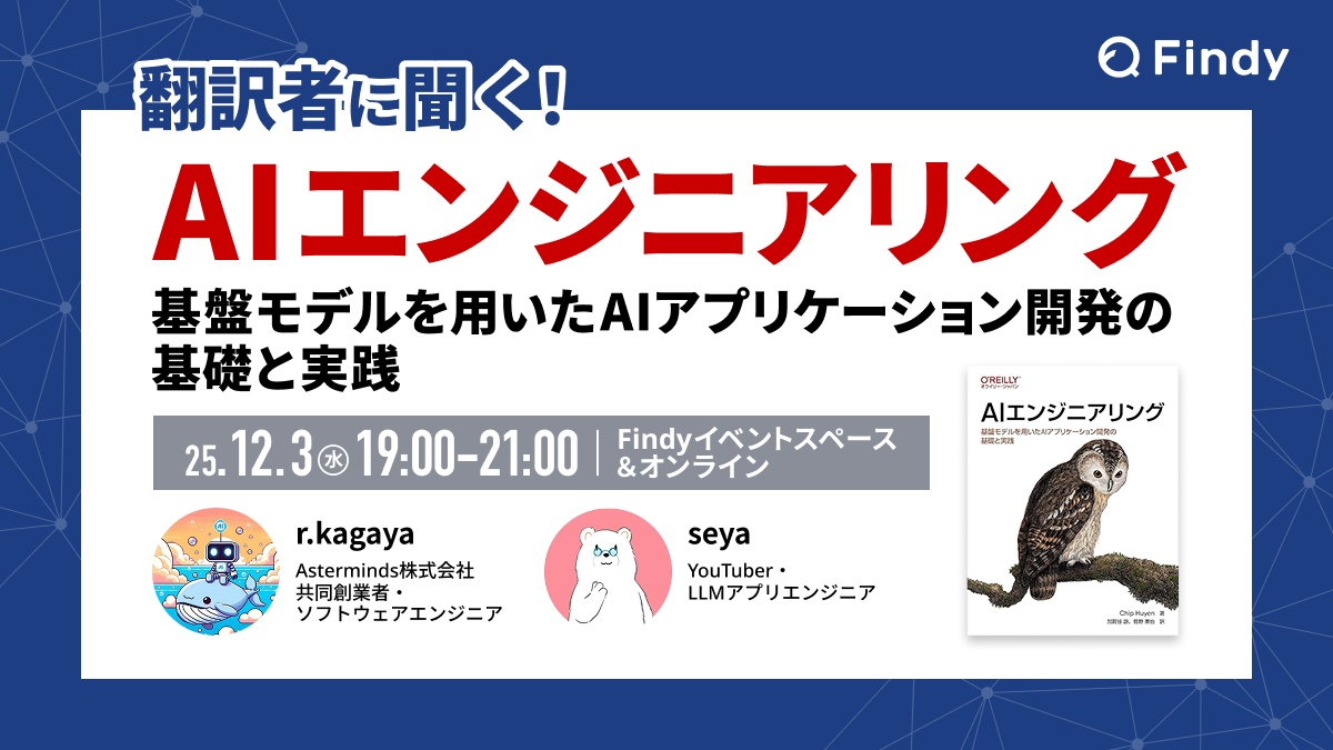 # 🎥 アーカイブ動画 アーカイブ動画はこちらから # ✍️概要 本イベントでは、11月28日に発売される『AIエンジニアリング ―基盤モデルを用いたAIアプリケーション開発の基礎と実践』の翻訳者、r.kagayaさんとseyaさんをお招きします。 「AIエンジニアリングの基礎と実践」をテーマに、講演やパネルディスカッションを通して、AIエンジニアリングの理解をより深めていただける場を目指します。 書籍の見どころやおすすめポイントもご紹介いただく予定です。ぜひご参加ください。 ## 🕛タイムテーブル 時間 | セッションタイトル | スピーカー ---|---|...
