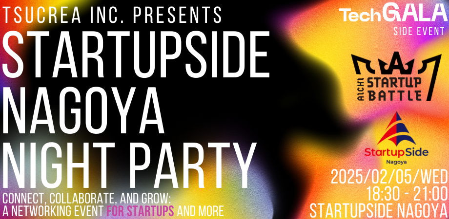 TechGALAサイドイベント「StartupSide Nagoya Nigth Party」開催! 🚩イベント概要起業支援のパイオニアである株式会社ツクリエが主催する、TechG... powered by Peatix : More than a ticket.