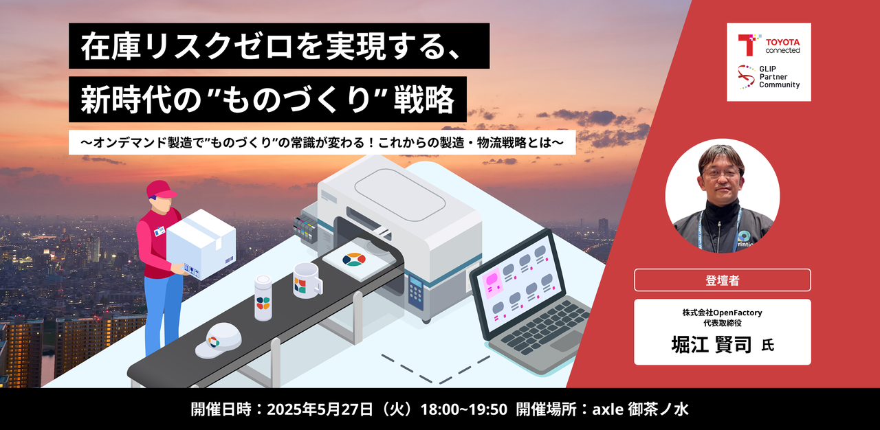 # イベント概要 「GLIP Partner Community ミートアップ」は社会課題解決や新たな事業創出を目指す方々に向けて、先駆者の知見を共有し、皆様のビジネス成長を支援する場です。 今回のテーマは「ものづくり× 物流×DX」です! * オンデマンド製造とは?従来の大量生産との違い/なぜ今「オンデマンド製造」が注目されているのか * デジタル技術が変えるものづくりと流通の仕組み/サプライチェーンの最適化と収益性向上の事例 * 「買う」側から「作る」側へ。オンデマンド製造がもたらす、無在庫マーケットの新たな市場機会 近年、コンテンツの消費や流行の移り変わりがかつ...