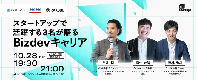 # 【BizDevトークセッション&Meetup】スタートアップで活躍する3名が語るBizDevキャリア 新規事業により非連続な成長を作る株式会社カケハシ、Sansan株式会社、ラクスル株式会社の3社を招き、BizDevキャリアに関心がある方向けのイベントを開催! 各社の第一線で活躍する3名にご登壇いただき、BizDevのリアルをトークセッション形式で語っていただきます。 イベント終了後は登壇者を交えた交流会も開催いたしますので、ぜひこの機会にご参加ください。 ### イベント詳細 「事業づくりを通じて、もっと自分の可能性を広げたい」 そう考え、BizDevという職...