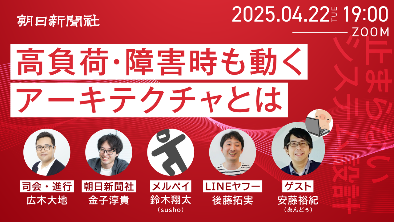 #### 開催概要 ## 「止まらないシステム」設計術:高負荷・障害時も動くアーキテクチャとは 堅牢性が求められるシステムにおいて、いかにシステム設計でそれを担保するのか。そこに焦点を当てた本イベント。 今回は大きなシステムダウンが人々の暮らしに影響を与えかねない朝日新聞、LINEヤフー、メルペイの3社における取り組みを深掘り、ディスカッションします。 #### 内容 * 堅牢性を保つためのシステム設計とは * 堅牢性をどこまで追求すべきなのか * 設計と運用、堅牢性に必要な両者をどう扱うべきか * 堅牢性のためのコストのかけかたはどうすべきか #### こん...