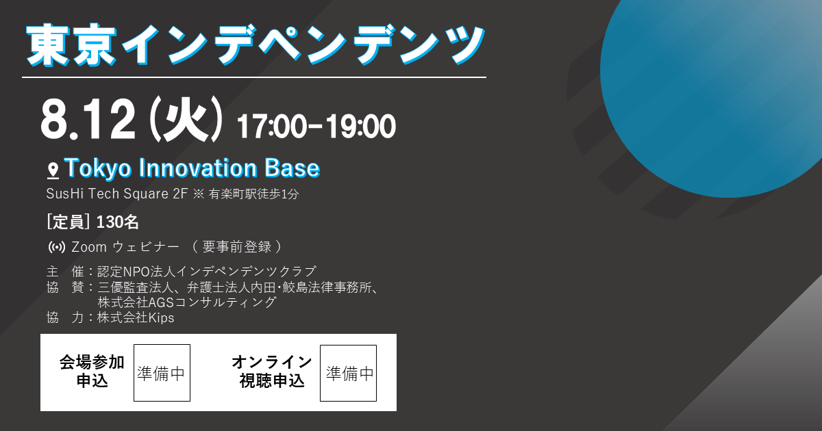 【プログラム】 第1部【特別セッション】「スタートアップM&A最新動向に迫る」 (パネリスト) ・株式会社ストライク イノベーション支援室 アドバイザー 石塚 吉光 氏 ・株式会社AI Samurai 代表取締役CEO 白坂 一 氏 (モデレーター) ・インデペンデンツクラブ 代表理事 松本 直人 氏 第2部【TPM上場表彰・特別対談】 株式会社RitaX 代表取締役社長 安藤 浩二 氏 ※2025年7月18日 TOKYO PRO Marketに上場(証券コード:393A) <株式会社RitaX> 所在地 : 東京都中央区銀座8丁目12-8 PMO銀座八丁目7F 事業内容:土木・建築設計事業 会社HP:https://ritax.jp/ 第3部【第613回事業計画発表会】 No.1596 ハッコウホールディングス株式会社(代表取締役CEO 入海 健 氏) 所在地 :神奈川県三浦郡葉山町上山口2178-2 事業内容:ルピナス豆を用いた発酵食品の製造販売、栽培・発酵技 術の研究開発 会社HP:https://hakko-holdings.com/ No.1597 株式会社Dinow(代表取締役CEO 髙橋 健太 氏) 所在地 :茨城県水戸市南町1-2-32 M-WORK 事業内容:生体試料を用いた健康状態管理サービス 会社HP:https://www.dinow.co.jp/ <コメンテーター> 植竹 彩圭 氏(弁護士法人内田・鮫島法律事務所 弁護士) 小原 靖明 氏(株式会社AGSコンサルティング 顧問) 【開催概要】 日 時:2025年8月12日(火)17:00-19:00 -------------------------------------------------- 会 場:Tokyo Innovation Base(東京都千代田区丸の内3-8-3 SusHi Tech Square 2F) 定 員:130名 アクセス:https://tib.metro.tokyo.lg.jp/#access JR山手線・京浜東北線「有楽町駅」京橋口|徒歩1分 東京メトロ有楽町線「有楽町駅」D9出口すぐ 東京メトロ有楽町線「銀座一丁目駅」1出口|徒歩3分