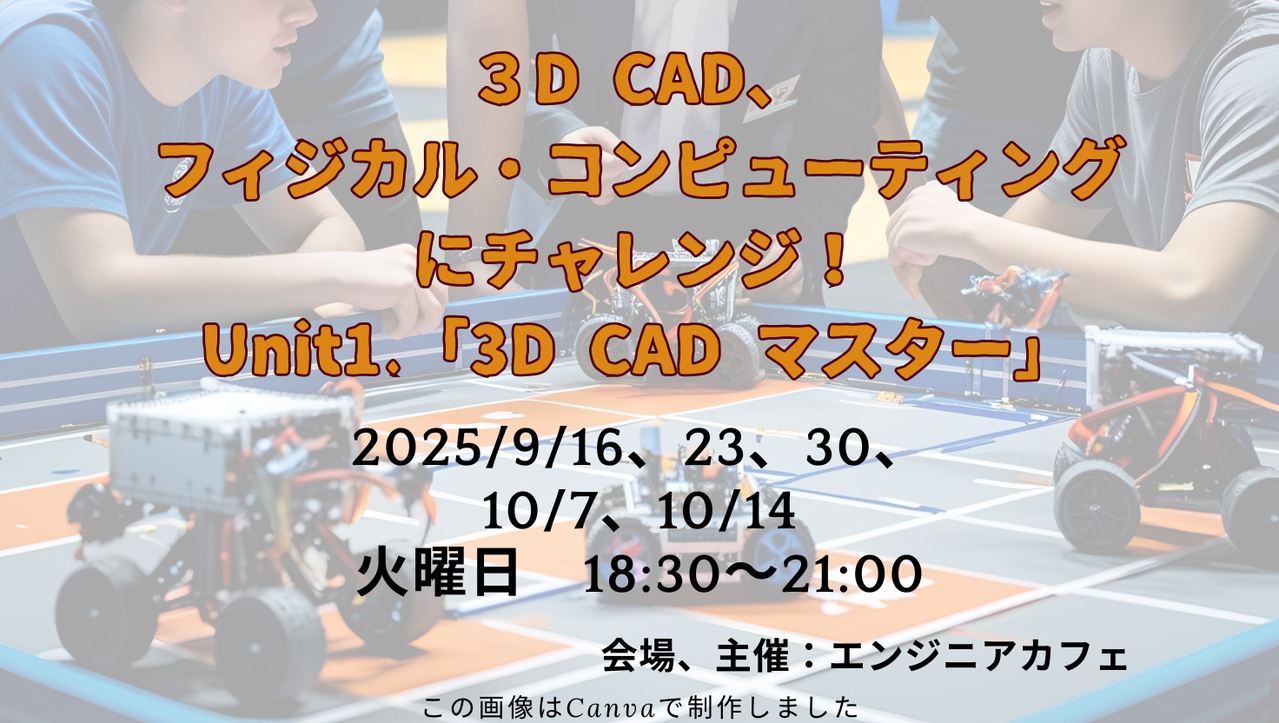 ## 3D CAD、フィジカル・コンピューティングにチャレンジ! 3D CADをマスターしたい、センサやモータなどを使った電子工作にチャレンジしたい、 というご要望にお応えするため、ロボットカーを題材に、下記の3部構成のイベントを企画しました: ■Unit.1 3D CADマスター ■Unit.2 電子工作にチャレンジ [11月予定] ■Unit.3 ロボットカー製作&競技 [12月予定] ※上記の3部構成を予定していますが、3D CADパートのみの参加も受け付けます。 ## Unit.1 3D CADマスター ~~2025/9/16 #1:3D C...