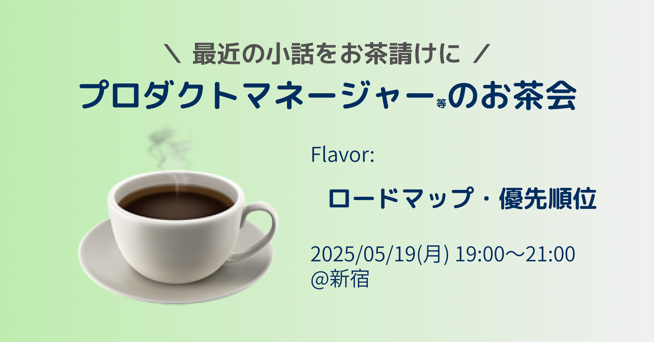 ## 小話をお茶請けにお茶しましょう プロダクトマネジメントに関する話をできる仲間、足りていますか! 勉強会のあとの懇親会でSNSをフォローするけれど、相談できる関係にはなりづらいのではないでしょうか。 この会は経験が近しい人との少人数のグループでじっくり話ができるような設計を心がけ、お互いの実践知から学ぶ場を目指します! ## 面白くなくてOK👌小話のお願い 初対面でお話を弾ませるのも難しいので、皆さんには「小話」をご用意いただきます。 参加者全員の前でプレゼンしてもらうのではなく、少人数のグループでの話のきっかけとして3分程度でご検討ください。 小話といっても、そんなに堅苦しい...