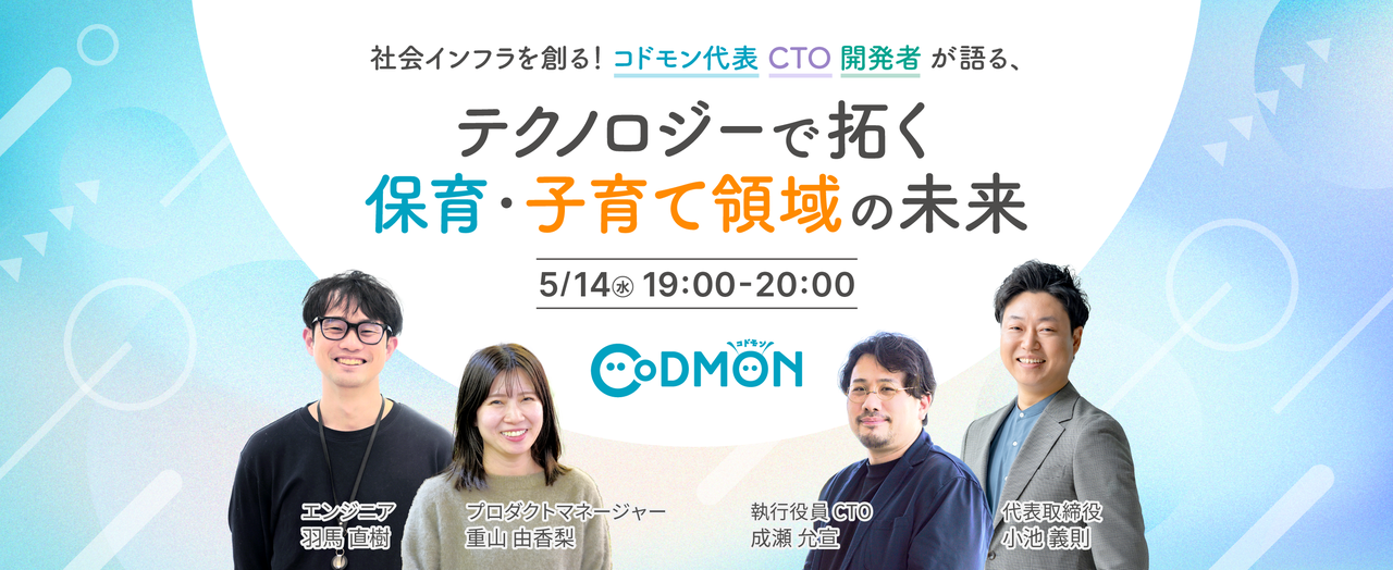 # 開催概要 ### 社会インフラを創る!コドモン代表・CTO・開発者が語る、テクノロジーで拓く保育・子育て領域の未来 コドモンは「子どもを取り巻く環境をテクノロジーの力でよりよいものに」をミッションに掲げ、保育・教育施設向けICTサービス「CoDMON」をはじめ様々なサービスを展開しています。しかし、保育・教育・子育ての領域では、まだまだ解決すべき課題が多く残っており、これらの課題をテクノロジーの力で解決すべく、エンジニアをはじめとする開発部の体制強化を目的に、CTOの役職を新設するとともに、ソフトウェア開発の第一線で活躍する成瀬允宣を執行役員CTOとして迎えました。 本イベント...