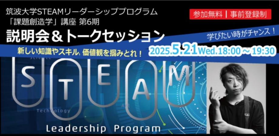 筑波大学STEAMリーダーシッププログラム 「課題創造学」講座 第6期 説明会&トークセッション 日 程 :2025年5月21日(水) 18:00~19... powered by Peatix : More than a ticket.