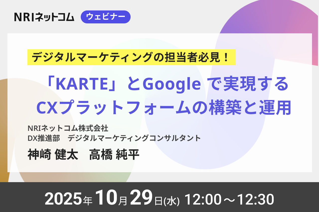 # ※本イベントはconnpassでのお申し込みをしていなくてもご参加いただけます。下記の【お申し込み】欄のURLよりご参加ください。 【ウェビナー概要】 本ウェビナーでは、CX(顧客体験)プラットフォーム「KARTE」を例に、デジタルマーケティング施策の業務設計から運用、インハウス化までのノウハウをご紹介します。 また、デジタルマーケティング施策を裏で支える、「KARTE Datahub」、「Google Cloud」、「Google アナリティクス 360」 からなるデータ基盤についても、わかりやすく解説します。 経営層から現場の担当者まで、デジタルマー...