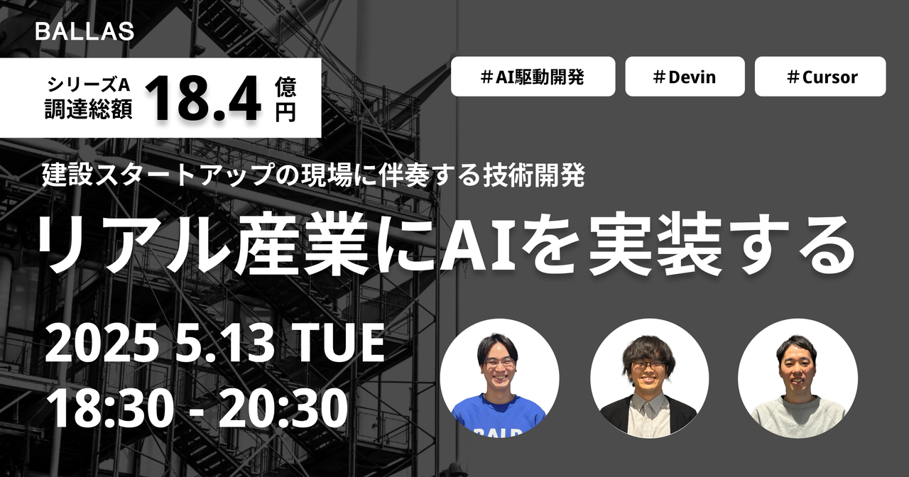 # ★【増枠!】追加調達完了!プロダクト開発を加速!お寿司を用意してお待ちしています ★ ご参加検討ありがとうございます! 本イベントでは、メーカー機能を備えたテックカンパニー 株式会社BALLAS(バラス) が、建設業界の構造課題に対して AIをどう実装しているか を、エンジニア視点で掘り下げてご紹介します。 建設部材の設計者との密なフィードバックループを前提に、部材設計の 自動化アルゴリズム をどのように構築・運用しているか。 また、開発チームが Devin や Cursor をどのフェーズ・目的で活用し、どういった技術的ブレイクスルーがあったかも実例として共有予定です。 ...