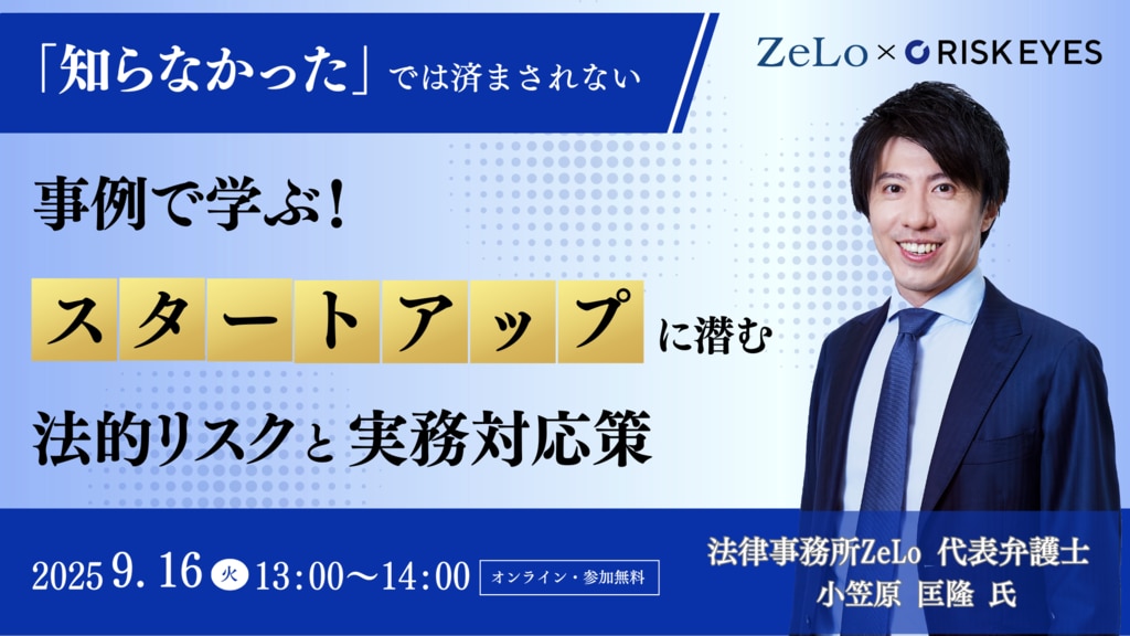 近年、企業の不祥事やトラブルはニュースでも頻繁に取り上げられ、一度発生すると企業価値を大きく損なうリスクがあります。 本セミナーでは、リスク管理や内部統制の整備に不安を抱えるスタートアップの経営者や法務・管理部門の皆様を対象に、スタートアップで発生しやすい不祥事やトラブルの事例を取り上げ、「何を準備し、どう対応すべきか」といった実務に直結するポイントを解説します。 自らもスタートアップを創業し、数多くのスタートアップを支援してきた法律事務所ZeLo代表・小笠原匡隆弁護士が、法的な観点から「トラブルを未然に防ぐ方法」と「万が一発生してしまった際の具体的な対応策」について、分かりやすくご説明します。
