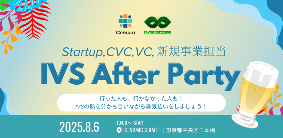 IVS2025に参加した方も、惜しくも参加できなかった方も大歓迎!スタートアップ・事業会社・VC・CVCが集まる夜。 暑い夏の夜、Crewwが主催するカジュアルでオープンな交流会で... powered by Peatix : More than a ticket.