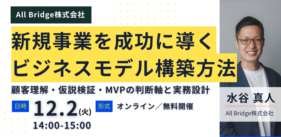 【大手企業の新規事業担当者向け】 新規事業を成功に導くビジネスモデル構築方法|顧客理解・仮説検証・MVPの判断軸と実務設計 * * * ## 💡 はじめに ビジネスモデルは「作ること」よりも、“社内で通すこと”の方がはるかに難しい。 特に大手企業の新規事業では、 * 既存事業の評価基準 * 事業部調整 * 経営層の判断軸 が複雑に絡み合い、ロジックが正しくても前に進まないケースが多くあります。 実は、ビジネスモデルが通らない理由の多くは、 “顧客理解 → 仮説検証 → MVP” の実務設計と判断軸が曖昧であることにあります。 本セミナーでは、多く...