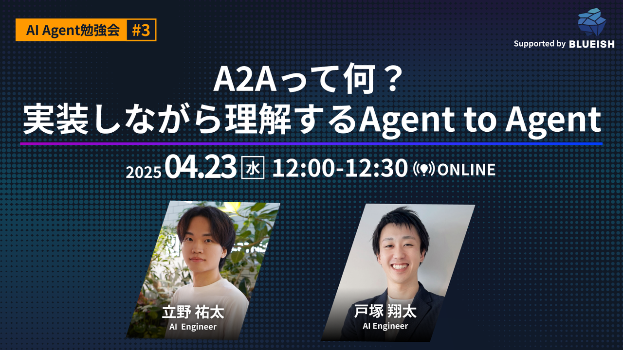 # ✍️ 概要 BLUEISHでは、「すべての業務プロセスをAI化する」というビジョンのもと、業務プロセスを最適化するAIソリューションを提供しています。 Google Cloudより、4月10日(木)に発表された新しいオープンプロトコル「Agent2Agent プロトコル(A2A)」がテーマのイベントです。 弊社のエンジニアが、実際に実装しながら理解を深めていきます。 これからキャッチアップする方や、興味がある方におすすめです。ぜひ、皆様のご参加お待ちしております! # 👩💻 こんな方におすすめ * Agent2Agent プロトコル(A2A)をキャッチアップし...