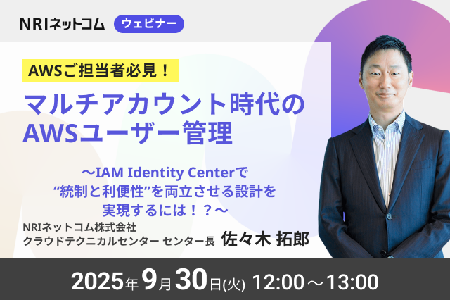 # ※本イベントはconnpassでのお申し込みをしていなくてもご参加いただけます。下記の【お申し込み】欄のURLよりご参加ください。 【ウェビナー概要】 AWSの利用が本格化すると、複数のAWSアカウントを活用する「マルチアカウント構成」が不可欠になります。その際に大きな課題となるのが、ユーザー管理です。従来のようにアカウントごとに個別にユーザーを作成する方式は、統制面・管理面で課題が顕在化しているのが現状です。 AWSでは、シングルサインオン(SSO)を実現するサービスとして IAM Identity Center が提供されていますが、その活用方法は、組織の規模や形...