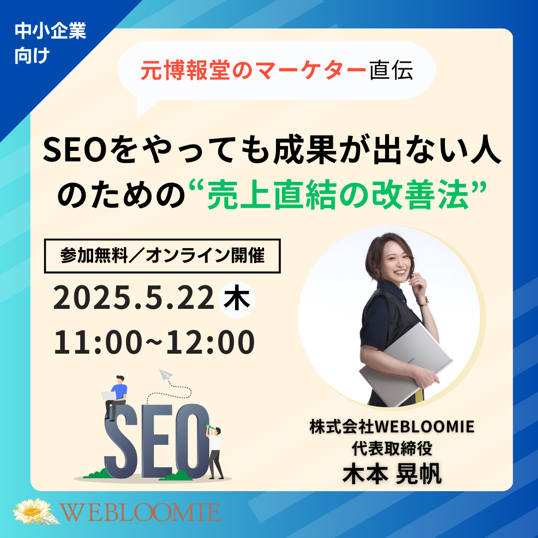 ◆◆内容◆◆ ページをご覧いただき、誠にありがとうございます。 マーケティング会社の、株式会社WEBLOOMIEと申します。 中小企業の経営者・マーケティング担当者のみなさま、こんなお悩みありませんか? 「SEO対策をしているのに、問い合わせが増えない」 「記事更新やコンテンツ追加をしているが、売上に結びつかない」 「SEO業者に頼んでいるが、費用に見合う効果が出ていない」 「ウェブからお問い合わせが来る仕組みを作りたい」 実は、こうした違いを生んでいるのは、“検索されて終わり”ではなく、“検索後に行動を起こしてもらうための仕組み”を持っているかどうかです。 そこで、中小企業の数十...