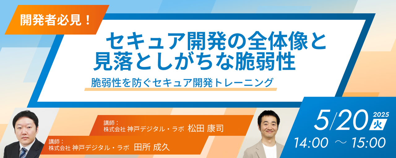 # セキュア開発の全体像と見落としがちな脆弱性 ~開発者必見!セキュア開発トレーニング~(5/20) ## セミナー概要 ソフトウェア開発において「脆弱性診断」は必須のプロセスです。しかし、リリース前の診断で検知された脆弱性の修正に、多大なコストとスケジュールが必要になることは少なくありません。また、診断を実施しても、ログの出力や検知の仕組み、ユーザーごとの権限など、診断では見つけられない脆弱性は開発者の経験と知識に委ねられることになります。 神戸デジタル・ラボでは、そのようなリスク、コスト、スケジュール遅延を低減するため、開発の初期段階からセキュリティに考慮する、「セキュア開発」...