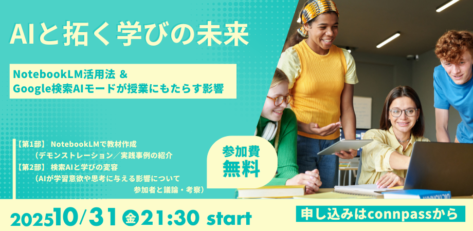 「AIを使った新しい授業アイデアが欲しい!」 「調べ学習は、これからどう変わっていくんだろう?」 そんな先生方のためのオンラインイベントを、Google教育者コミュニティ GEGNARA が開催します! 今回のテーマは、文書の読み込みや要約、アイデア出しに絶大な効果を発揮する「NotebookLM」と、ますます進化する「Google検索」です。 金曜の夜、少し遅い時間ですが、全国の先生方と一緒にAI時代の学びについて考え、明日からの授業に活かせるヒントを見つけませんか? こんな方におすすめです! 授業準備や教材作成を、AIでもっと効率化したい先生 参加者の皆さんと一緒に、これか...