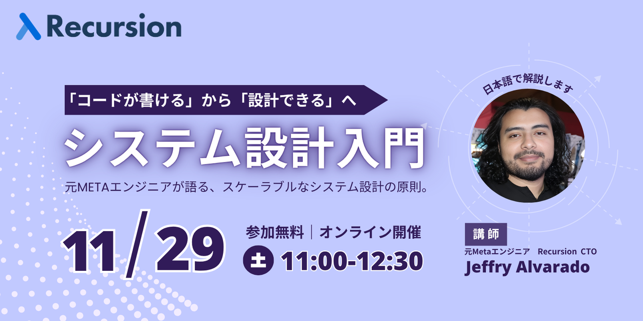 # イベント概要 本イベントは、1.5時間で「大規模なアプリケーションを設計するための基礎概念」を学ぶことを目的としたオンラインワークショップです。メガベンチャーや外資系テック企業では、技術面接・実務の両面でシステム設計の理解が強く求められます。 本講義では、大量のデータやアクセスを処理するアプリケーションを例に、スケーリング・アーキテクチャ設計・データベース構成などの基本概念を整理します。 ## 講義内容 ###### スケーリングの基礎 * 単一サーバ構成の限界 * 垂直スケーリング * 水平スケーリング * 可用性と冗長化 ###### 代表的なスケーリ...