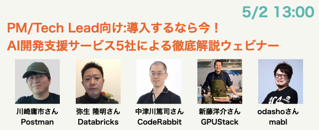 生成AIやLLMの進化に伴い、ソフトウェア開発の現場にもAI活用の波が急速に押し寄せています。 本ウェビナーでは、AI機能を搭載した開発支援サービスを提供する注目の5社が集結。プロジェクトマネージャーやテックリードの方々に向けて、「実際にどう導入できるのか」「どんな課題を解決できるのか」をわかりやすく解説します。 各社ごとに特長のあるサービスを学びながら、導入の意思決定に必要な情報を各15分で効率的に収集できます。導入検討中の方はもちろん、最新のAI開発支援ツールの動向を知りたい方にもおすすめの内容です。 ## 対象者 * テックリード、プロジェクトマネージャー * ...