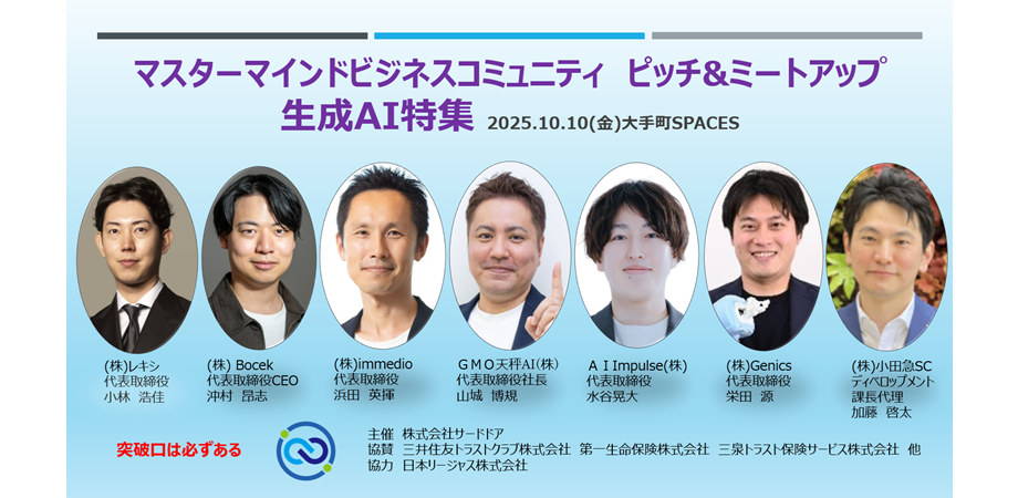 マスターマインドビジネスコミュニティ(主宰:株式会社サードドア代表取締役土橋幸司)は、2025.10.10(金)18:00~大手町SPACESにて生成AIサービスをテーマにピッチ&... powered by Peatix : More than a ticket.