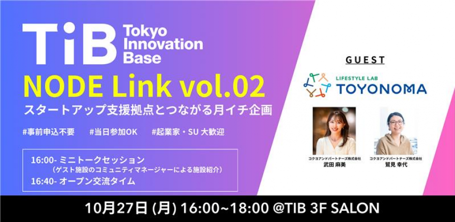 NODE Link vol.02〜スタートアップ支援施設とつながる、ひらく〜 TIBでは、都内近郊のスタートアップ支援施設やインキュベーション施設のコミュニティマネージャー/運営者... powered by Peatix : More than a ticket.