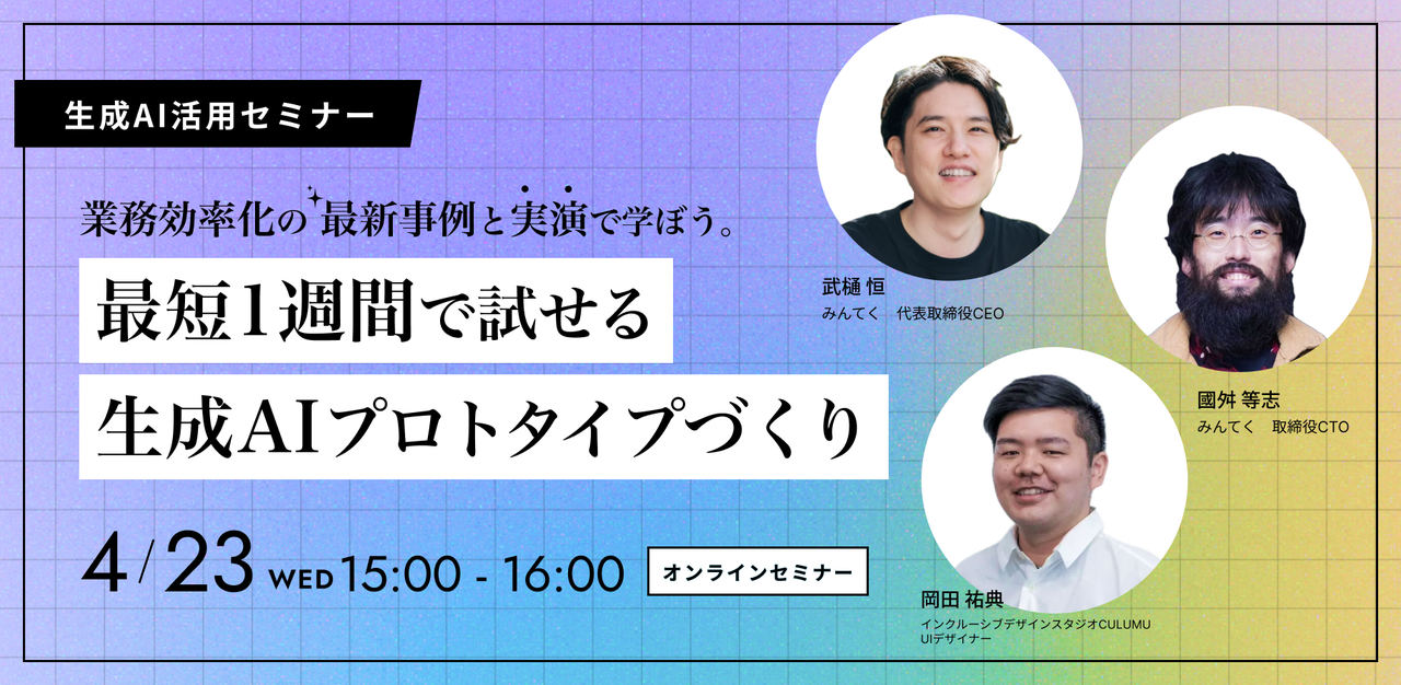 生成AIの業務活用を支援する株式会社みんてくと、企業と社会の課題解決を支援するインクルーシブデザインスタジオCULUMUが、業務現場での実用性を重視した生成AI活用セミナーを開催します。 生成AIの進化により、従来の時間や工数がかかっていた業務が効率化されつつあります。 今回のセミナーでは、「業務で使える」視点から、企画・資料作成・社内ツール試作といった日常的な業務での活用事例を紹介します。 セッション1では、生成AIを使った最新事例を通したプロジェクト立ち上げの具体的なステップを、心理的・実行障壁の乗り越え方も含めて解説。セッション2では、リソースが限られた環境でも実行可能なプロト...