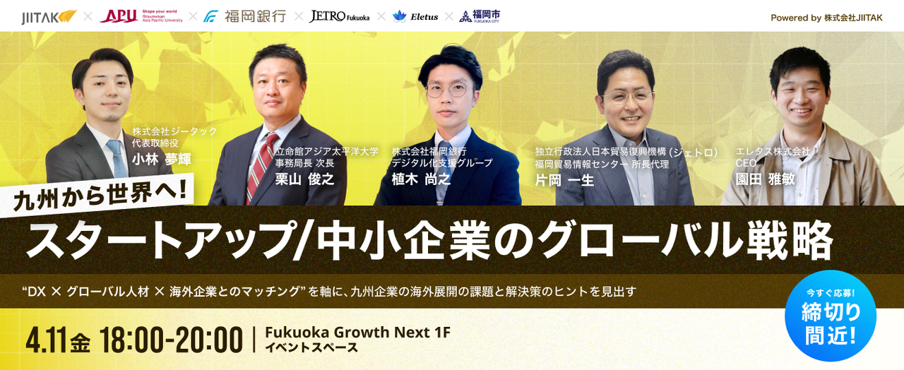## 🌍「九州から世界へ」その一歩を、ここから。🌍 #### 「海外展開に興味はあるけれど、何から始めていいかわからない」 そんな起業家やスタートアップ、中小企業の皆さまに向けて企画したイベントです。 人口減少が進む日本において、企業が持続的に成長していくためには、 国内だけでなくグローバル市場を視野に入れた事業展開がますます重要になっています。 特に九州は、アジアに近いという地理的な優位性を持ち、行政や支援機関によるサポートも充実しています。 しかし、「グローバル展開」という側面では、こうした強みを十分に活かせていない現状があるのかもしれません。 「情報が足りない」...