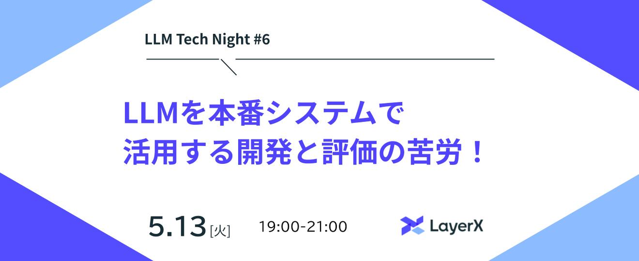 ## LLM Tech Night #6 by LayerX このイベントでは、「LLMを本番システムで活用する開発と評価の苦労!」をテーマに、使用技術、技術的な意思決定、チームワーク、評価と改善、ビジネスとの接続などについて共有する機会としています。 技術革新の最前線で活躍したい方、自身のキャリアに新たな価値を加えたい方は、ぜひご参加ください! ### こんな方にオススメ * LLM技術やAIに興味があり、その可能性を探求したい方 * ソフトウェアにLLMを組み込むことで生じるチャレンジに興味がある方 * 革新的な技術を活用してキャリアを築きたいと考えている方 ...