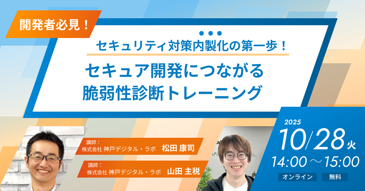 # セキュリティ対策内製化の第一歩!セキュア開発につながる脆弱性診断トレーニング(10/28開催) ## セミナー概要 開発チームが自ら脆弱性を理解し、改善できるスキルはセキュアなシステム開発を推進する上で欠かせません。神戸デジタル・ラボ(以下KDL)では脆弱性診断を内製化し、お客様向けに開発したシステムに対して、脆弱性診断を実施しています。この診断を内製化する取り組みをきっかけに、KDLではセキュア開発における課題や対策が見えてきました。 本セミナーでは、KDLで「脆弱性診断を内製化してわかったこと」 をテーマにお話しし、実践してみてわかった課題や対策を事例とともにご紹介します。...