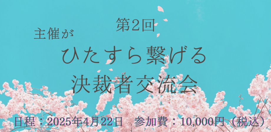 前回の繋げる交流会が大好評だった為、第二回【主催がひたすら繋げる決裁者交流会】を開催いたします! 今回は、部長以上に限定した決裁者交流会となりますので、より質を求めた交... powered by Peatix : More than a ticket.
