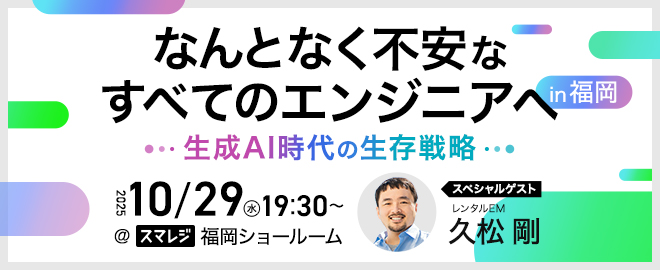 ## 🎉イベント概要 「このままでいいのかな」——そんな漠然とした不安を抱えたことはありませんか? 生成AIの進化で、技術も働き方も急速に変化する今。私たちエンジニアは、これからどう生きていけばいいのか。 本イベントでは、ゲストの久松さんをお迎えし、福岡という地で働くからこそ感じる “なんとなく不安” に真正面から向き合います。 堅苦しいセミナーではなく、ざっくばらんに語り合い、未来へのヒントを一緒に見つける カジュアルMeetup です。 ### 💡イベント詳細 生成AIの進化により、エンジニアのキャリアは見通しづらくなり、「このままでいいのか」と感じる場...