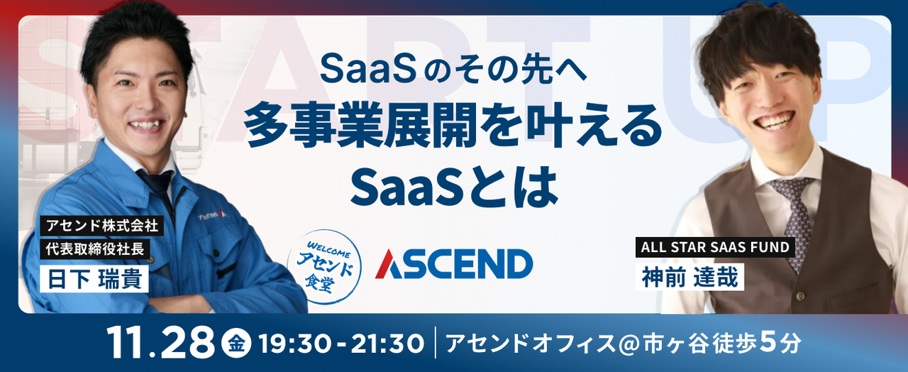 アセンド株式会社は、シリーズBラウンドで11億円の資金調達を実施し、累計調達額は18億円となりました。 今回の資金調達により、運送管理SaaS「ロジックス」を起点としながら、運送事業者・荷主企業・協力会社を横断してつなぐ新たな物流ネットワーク基盤の構築、そしてサプライチェーン全体の変革を見据えた新規事業展開を強化します。 わずか200万程のARRしかない時代将来から構想に共感し、投資を通じて大きな支援をいただいてきたALL STAR SAAS FUNDの神前氏と一緒に、多事業展開の核を成す「SaaS」とはどのようなものなのか、どうすればそのようなSaaSが展開できるのかなど、深堀りし...