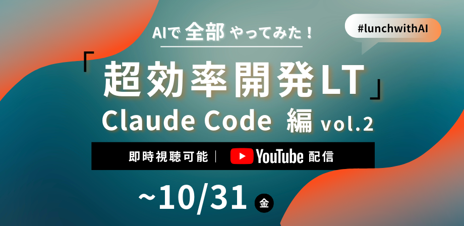 ## 【AI技術×ランチLT】Claude Codeを使ってプロダクト開発や個人開発の効率はどこまで変えられる? ※本イベントはITエンジニアとして働く方向けの内容です。 ※8/28(木)に開催したイベントのアーカイブ配信です ### 【本イベントについて📕】 プロダクト開発や個人開発で生成AIを使いこなして“超効率開発”を実践するエンジニアやPdMが登壇し、現場目線のリアルな経験と実践ノウハウをシェアする技術LT会です。 ランチタイムにサクッと参加できるので、平日日中にまとまった学習時間を取りづらい忙しいエンジニアのインプットにピッタリ! 第二回となる今回もClaude C...