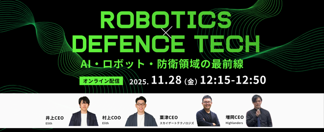 # 「Robotics x Defense Tech」領域の最前線 日本・世界で急拡大するロボティクス/防衛テクノロジー領域について、ウェビナーを開催します。 最前線で事業を展開する3社のCEOが登壇します。 “適用領域 × コア技術” の視点から、 各社の取り組み、世界の動向、日本の空白領域(ホワイトスペース)を読み解き、 これからの産業機会について議論します。 # セミナー詳細 ## こんな人におすすめです * AI×防衛の領域に興味関心のある方 * 重工業・防衛関連メーカーの方 * インフラ・建築・ゼネコンの方 * ロボティクス / AI / セ...