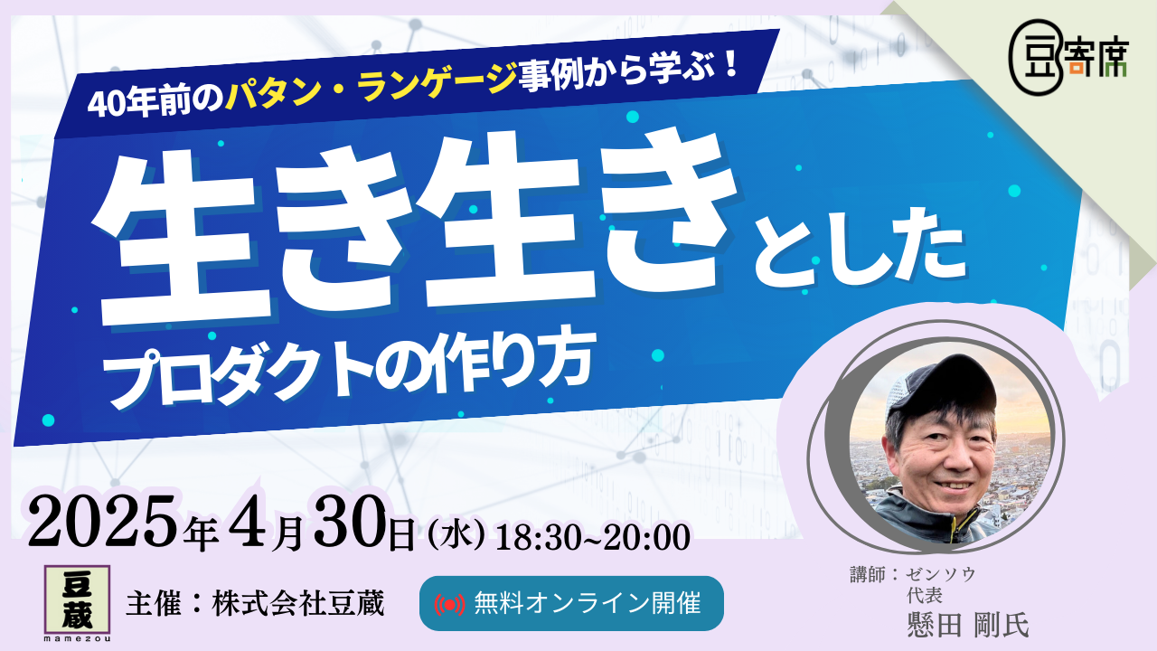 # ~一粒の知性がエンジニア人生を変える~オープンな技術イベント『豆寄席』の開催です! 豆寄席は、豆蔵が毎月行なっている技術イベントです。 業界のスペシャルな方や豆蔵のコンサルタントが講演し、気軽に質問や交流をしています。 # 開催概要 イベント詳細 ・日時:2025年4月30日(水) 18時30分~20時00分 * * * 【タイムスケジュール】 18時30分~20時00分 ※質疑応答含む > > 本講演では、現代のAI時代にも通じる「生き生きとしたプロダクト」を作るためのヒントをご紹介いたします。世界最大のパタン・ランゲージの事例として有名な盈進学園東野高校(埼玉)の建...
