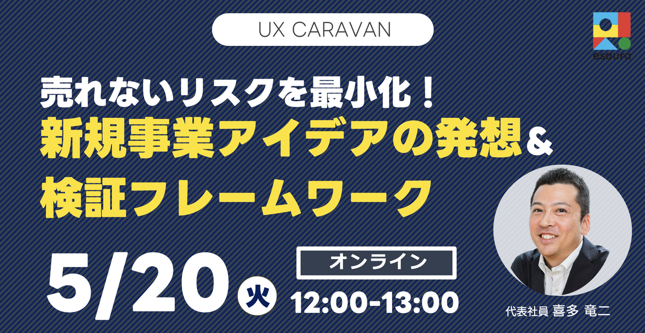 # 売れないリスクを最小化!新規事業アイデアの発想&検証フレームワーク 自社の新規事業開発を担当している方向けに、「生活者の日常的なシーンを起点にアイデアを発想し、ユーザーの新しい体験として具体化していくフレームワーク」をご紹介します ### UX CARAVANとは 自社でUXデザインを実践するのに役立つノウハウ、事例、トレンド情報をお届けしています。 セミナー開催100回、メンバーも1,000人を超えました。 ぜひ、グループ( https://ux-caravan.connpass.com/ )にご参加ください! # セミナー詳細 本セミナーは、ある生活者の日常的なシーンを...