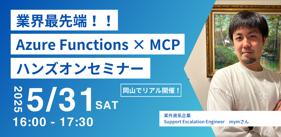 # 【Tech Guild】Azure Functions × MCP ハンズオンセミナー Azure Functions × Model Context Protocol (MCP) を使って、AIエージェントに「ツール」を持たせる最新技術に触れてみませんか? 本イベントでは、Anthropic社が提唱する 「AI 用の USB-C ポート」である「リモートMCP」の仕組みと、それをクラウド上で動作するために Azure を使用する実践的な方法を学ぶことができます。ハンズオン形式で、AIとクラウドが融合する未来を体験しましょう! セミナー後は懇親会も開催予定!興味のある方はお気軽...