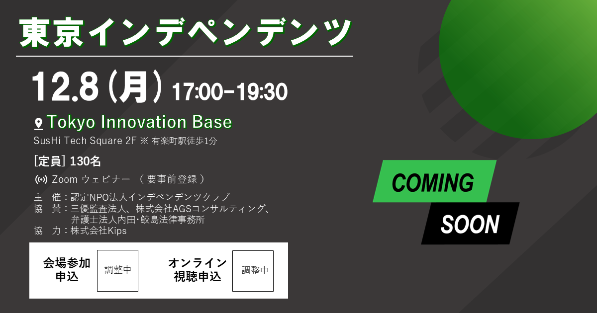 【プログラム】 17:00~【イントロダクション】 17:10~【第1部】特別セッション「グローバル・スタートアップ・キャンパスの描く未来」 (パネリスト) ・内閣官房 グローバル・スタートアップ・キャンパス構想推進室 参事官 當間 重光 氏 ・目黒区議会議長 鈴木まさし氏 17:50~【第2部】第623回事業計画発表会 ※1社につき20分(質疑応答含む) No.1619 SOUNDY株式会社(代表取締役 山田 裕嗣 氏) 所在地 :静岡県静岡市清水区草薙1丁目13-19 S-oneビル2階 事業内容:オーディオ用電子部品の企画開発・販売、OEM製品の企画開発・販売 会社HP:https://soundy.co.jp/ No.1620 Veneno Technologies株式会社(代表取締役社長 久野 孝稔 氏) 所在地 :茨城県つくば市千現2-1-6 事業内容:ジスルフィドリッチペプチドをベースとした新規な医薬品・農薬・バイオケミカルの研究開発 会社HP:https://veneno.jp/ja/ ※ほか調整中