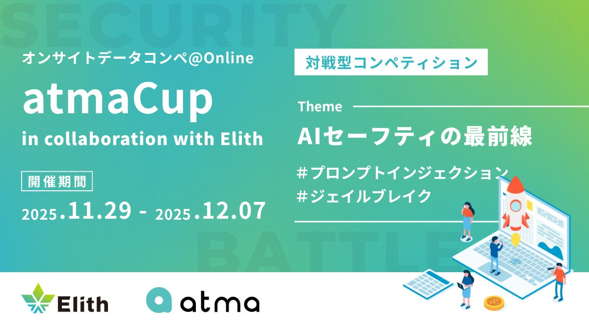 # 開催概要 ## atmaCupとは atma株式会社 が主催するデータコンペティションです。 データコンペティションとは、主催から配布されるデータを分析し、設定された課題に対して予測を作成し、その精度を競うイベントです。atmaCup は実際に集まって分析を行う点、短時間で分析を行わなくてはならない点が特徴のコンペティションです。 第21回となる今回は 株式会社Elith 様の共同開催です!! Elithは、クライアントと共に課題を発見し、AIによる最適な解決策を共創するパートナーです。人・組織・技術といった多様な「粒子」を融合させ、混沌を恐れず活かすことで、エネルギーを...