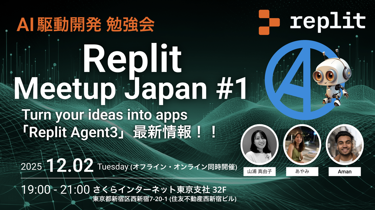 # AI 駆動開発勉強会【Replit Meetup Japan #1】 ## イベント概要 Replit の AI アプリ開発ツール「Replit Agent」の活用と進化に迫る!! Replit Agent は、環境構築不要でブラウザ上で即座にアプリ開発を始められる画期的なツールです。他の AI 開発ツールは環境設定やコマンドライン操作が必要で難易度が高いと感じる方も、Replit なら自然言語で指示するだけでフルスタックアプリケーションを構築できます。プログラミング初心者から経験豊富な開発者まで、誰もが AI 駆動開発の恩恵を受けられるのが Replit の大きな魅力です。 ...