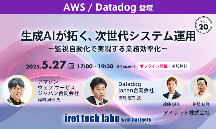### 開催概要 2025年5月27日(火) 17:00〜19:30「iret tech labo with partners #20」を開催します。 今回は、アマゾン ウェブ サービス ジャパン合同会社 尾崎 周也 氏と Datadog Japan合同会社の高尾 恵司 氏をお迎えし、『生成 AI が拓く、次世代システム運用 〜監視自動化で実現する業務効率化〜』についてお話しします。 ▼こんな方におすすめ▼ ・クラウド環境における運用管理の高度化・自動化を検討されている方 ・Datadog の最新機能に関心がある方 ・生成 AI や AIOps を活用した自動化・高度化...