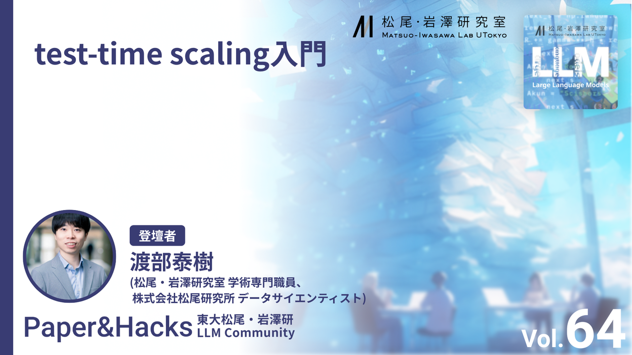 本イベントは、原則毎週火曜日20:00から松尾・岩澤研究室 LLMコミュニティが主催するLLMに関する輪読会 & 実装のオンラインイベントです。 ## イベント概要 対象: 普段から論文を読んでいる/普段からLLMの実装を行なっている方々 レベル: ★★★★☆ (Expert) 発表者: 松尾・岩澤研究室 学術専門職員、株式会社松尾研究所 データサイエンティスト 渡部泰樹 タイトル: 「test-time scaling入門」 発表カテゴリ: やや理論寄り(応用もあるがベースは理論寄り) イベント内容: 推論時の計算量を増やすことで性能を向上させるtest-time sca...