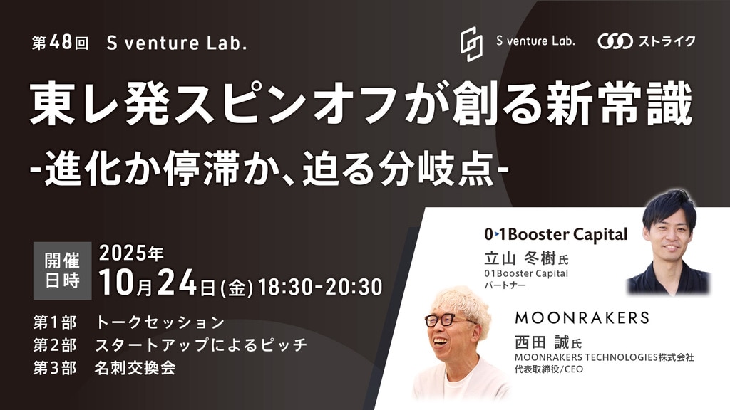 本イベントでは、東レ株式会社発のスピンオフベンチャー企業MOONRAKERS TECHNOLOGIES(ムーンレイカーズ テクノロジーズ)株式会社の代表取締役/CEO西田 誠 氏に登壇いただきます。 西田氏は東レで2度の新規事業立ち上げを経験した後、3度目の挑戦として「出向起業」制度を利用し、スピンオフによる独立を選びました。 本イベントでは、独立に至るまでの経緯、資本構成の工夫、親会社との関係づくりなど、大企業がイノベーションを生み出すために必要なこと、そしてそれがなされた時の圧倒的な破壊力を、当事者ならではの視点で語ります。