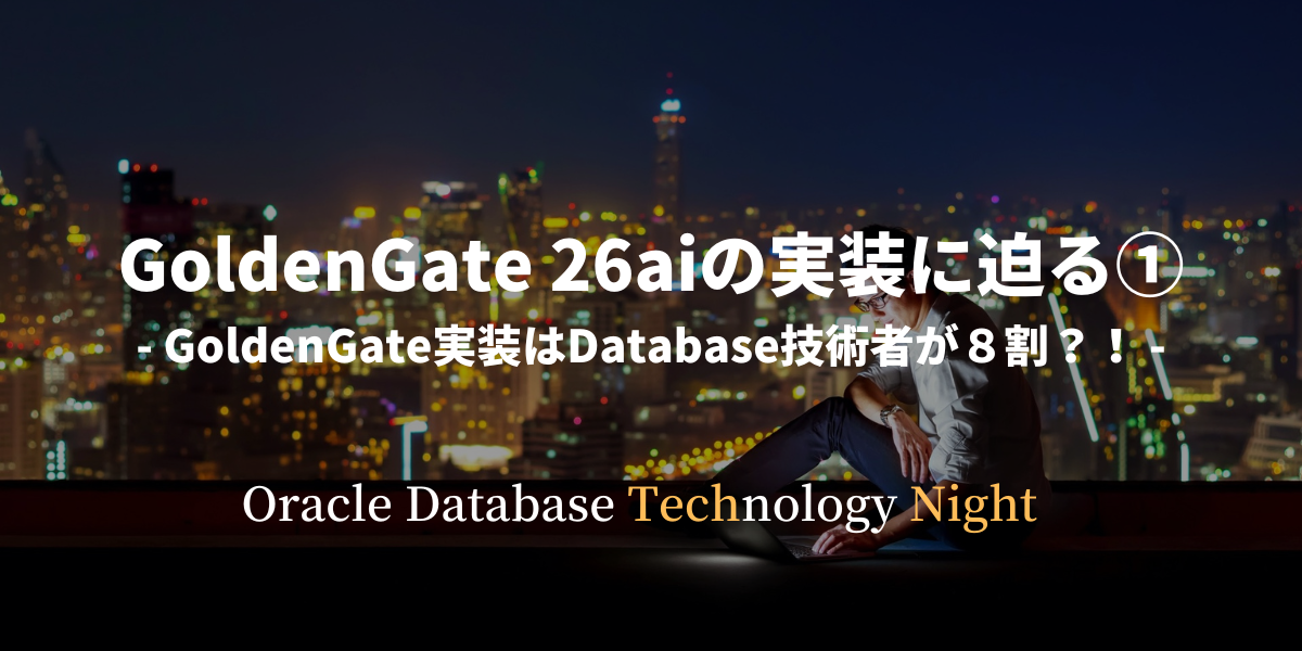 ## Oracle Database Technology Night って? オラクルのユーザーとユーザーが繋がり、データベースの技術や運用にフォーカスしながら、最適な使い方を見出していただく場です。 毎回、各テーマを設け、オラクルの精鋭の技術者陣が、日々のデータベース運用のための最良のTipsや将来のITインフラのアーキテクチャ設計に必要なヒントなど、「明日から現場ですぐに使えるテクニック」をお伝えしています。 ### 今回は・・・ GoldenGate 26ai の実装に迫る!〜 GoldenGate実装はDatabase技術者が8割?! > データがAIの源泉に...