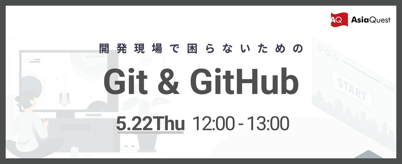 # 開催概要 アジアクエスト デジタルインテグレーション部は、GitやGitHubを用いたWebアプリケーションの開発を行っています。 Gitを使うとどういうメリットがあるの? バージョン管理システムってなに? 本イベントは、Gitの基本的な使い方から始め、GitHub上での開発に必要な基礎知識について学ぶことができるセミナー形式のイベントです。 デモではGitHubを用いてのコミット~プッシュ~マージの流れを、簡単な画面の文言やデザイン変更をお見せしながらレクチャーします。 ※ 本イベントは録画させていただきますので、あら...