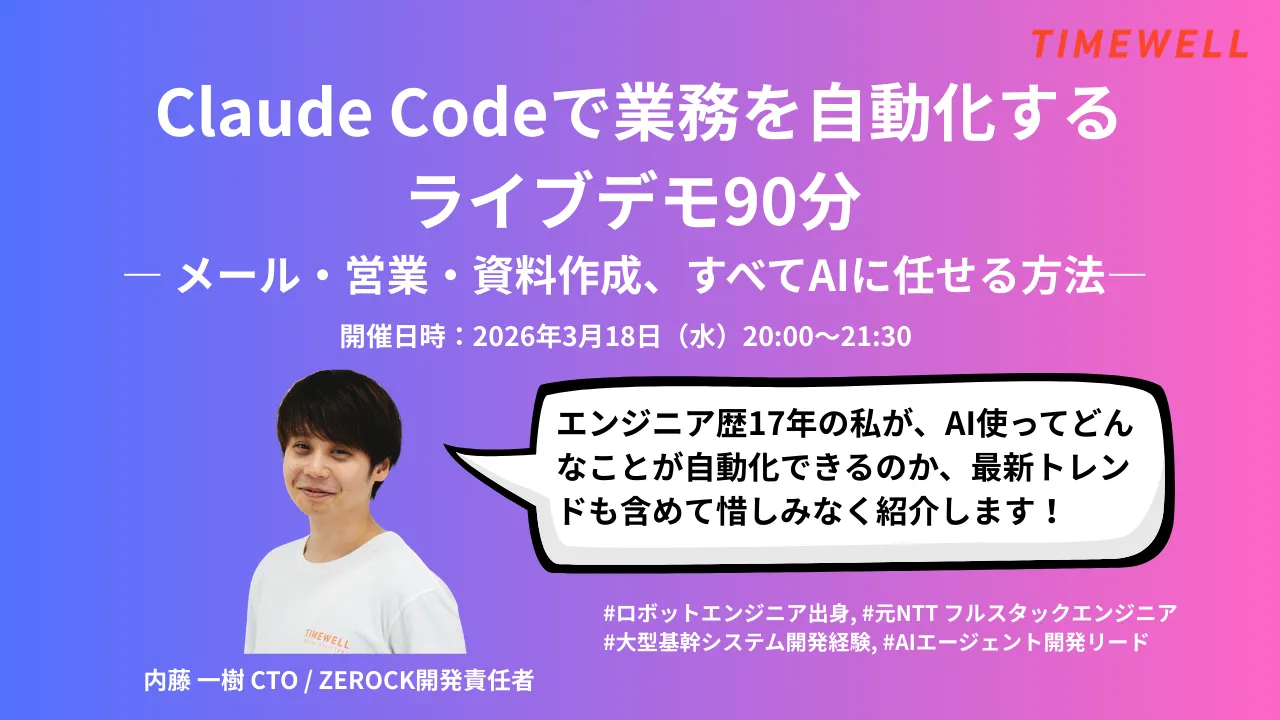 ロボットエンジニア出身。元NTTのフルスタックエンジニアとして大型基幹システム開発を経験後、TIMEWELLでAIエージェント「ZEROCK」の開発を統括。自らAIエージェントを設計・実装している開発者が、そのまま目の前でライブデモを実演します。